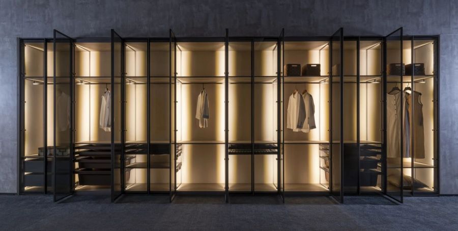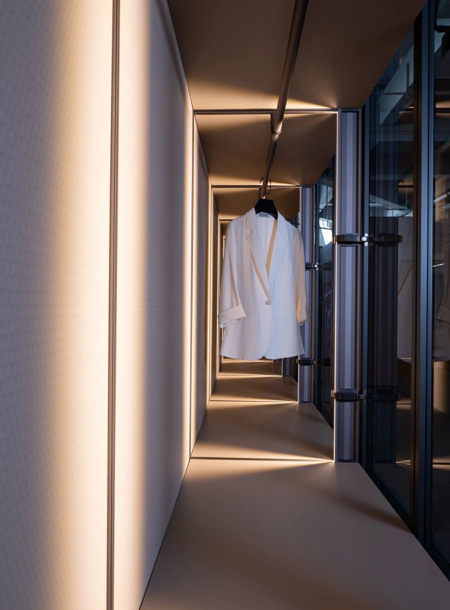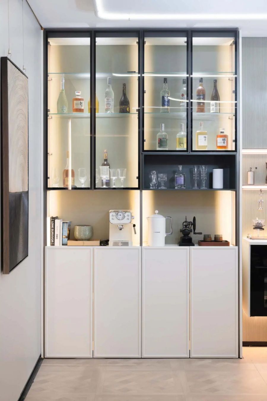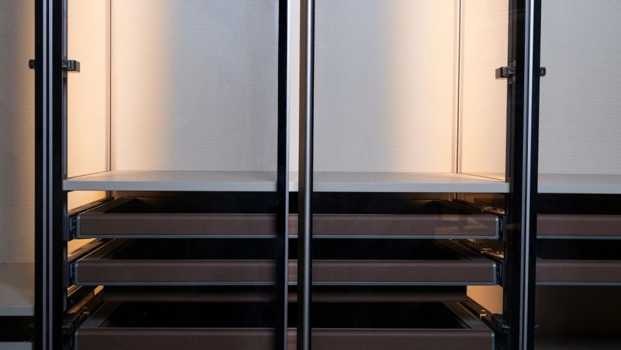 友邦筑家百變柜在整體結構的穩固性與產品細節體驗上也精益求精。柜體和墻面鋁材連接,門板鉸鏈與立柱連接,層板整條鋁合金連接,長久使用依然牢固安全。柜體與墻地無縫銜接,配合門板密封防塵條,有效阻隔灰塵侵入。內置線燈,開門即亮,光線柔和均勻照亮收納區,取物一目了然。